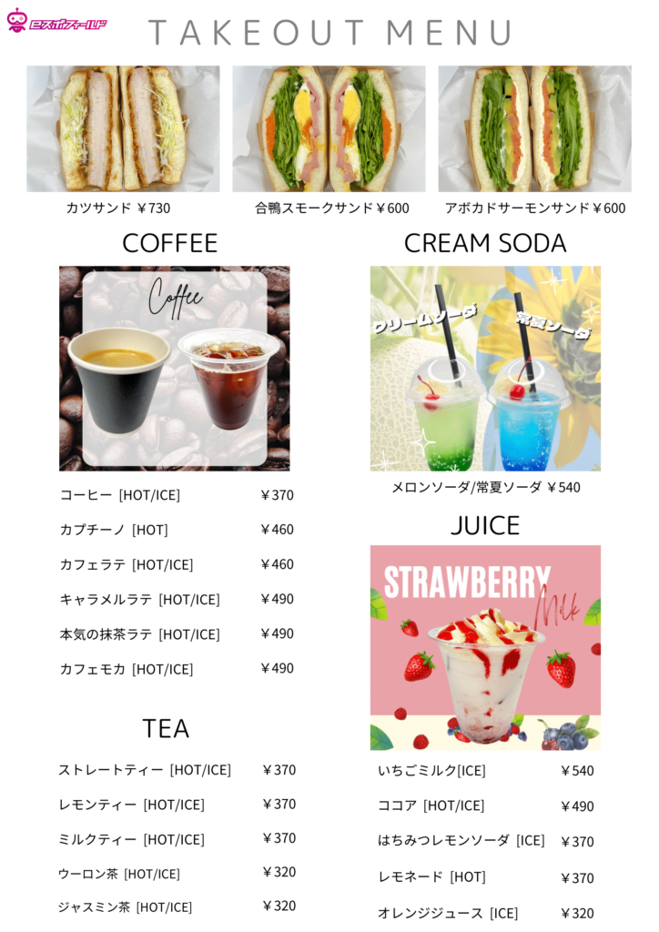 【お知らせ】新メニュー追加! / お知らせ / By e-spo こんにちは、eスポフィールドです!この度、4月1日より新メニューが追加されました。 メインメニューにはサラダやスープもご用意!お腹が空いていてもご満足いただけるようなメニューを増やしました♪ デザートやドリンクも新メニューが追加されております! はちみつレモンソーダ ハンバーグランチ 合鴨スモークサーモンサンド 本気の抹茶ラテ また、テイクアウトにドリンクメニューが追加されました!お気軽にお立ち寄り下さい! すべてのメニューはこちらから!eカフェについてはこちらから! 新しくなった当店に、是非お越し下さい!皆様のご来店をお待ちしております。