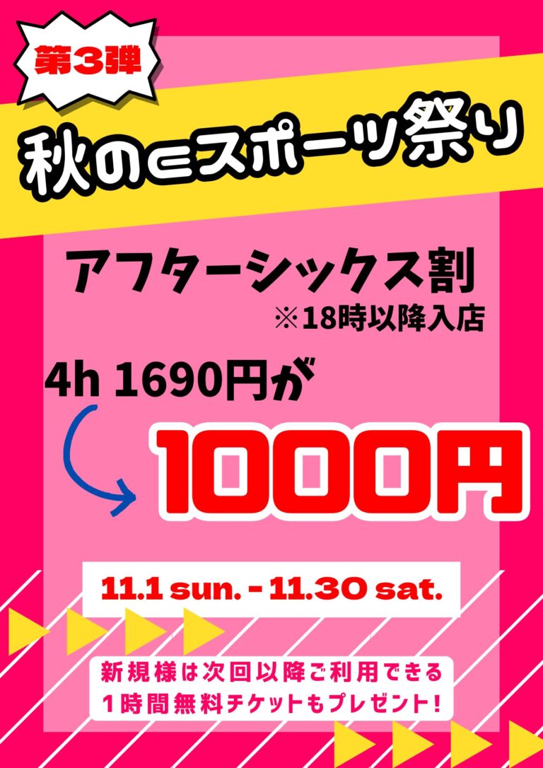 ご来場者様全員対象!18時以降の入店でゲーム4hが¥1,690から、¥1,000(税込)に!!!