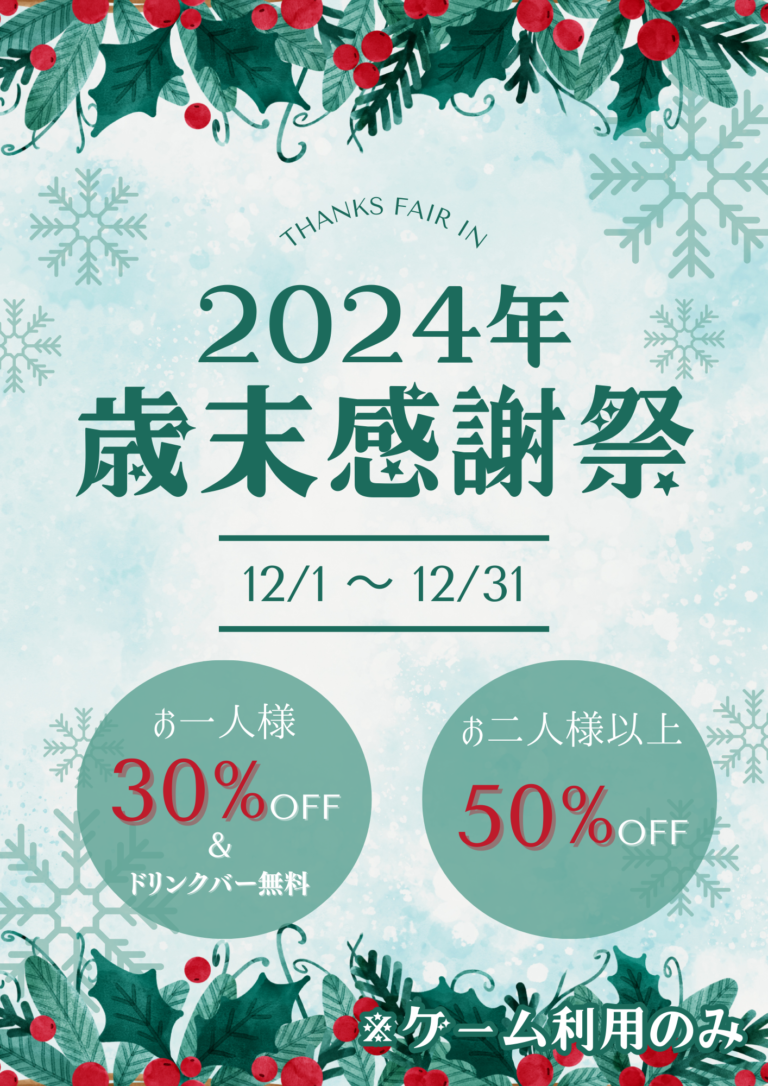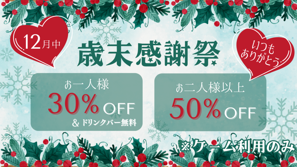 【全対象】12月1日~「2024年歳末感謝祭」開催‼ / お知らせ / By e-spo こんにちわ!eスポフィールドです!今年も残り1ヶ月…そこで、当店ではこの度「2024年歳末感謝祭」を開催いたします!2024年にご来店いただいた皆様に感謝の気持ちを込めて…!今年をゲームで締めくくりましょう!!!詳細は以下のとおりです!【キャンペーン内容】ご来場者様全員対象!ゲーム利用が…お1人様でのご来店が”30%OFF”&”ドリンクバー無料”!!!お2人以上のご来店で”50%”OFF”!!!【開催期間】12月1日~31日皆様のご来店を心より、お待ちしております!